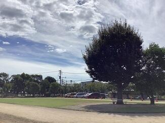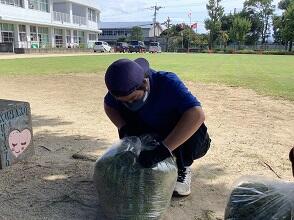 台風接近中の9月16日。暑い日差しに負けず、運動場で作業する高等部の生徒たち。芝刈り機で刈った山盛りの草をビニール袋に入れて処分しました。汗をかきながらテキパキと作業をする姿がとても輝いていました!