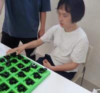 この日、生徒は、「前後左右」と「上下」について学習しました。前後左右の学習では、自分の身体を基準にして感覚的に捉えることができるよう、画像のように床に枠を描き、教師の「みぎ♪ひだり♪」の声かけに合わせて指示された囲いにジャンプする活動に取り組んでいます。また、「上下」については、生活の中で経験のある「紐通し」を題材に、教師の「下から通して上に出してね」の声かけを頼りに教材に開けられた穴に紐を上から通したり、下から通したりする学習に取り組みました。