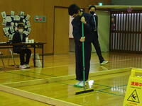 技能検定は、「テーブル拭き」、「水拭きモップ」の2種目で行われ、試技で「ダスタークロス」の成果発表もありました。