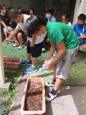小学部4年生は、1学期のホウセンカに引き続き2学期はプランターにコスモスの花の種を植えました。人差し指で穴を掘り、種をまいて優しく土をかけていました。最後には芽がでるようにとたっぷりと水かけました。これからは、毎朝コスモスの水やりを行っていきたいと思います。