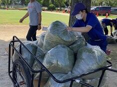 台風接近中の9月16日。暑い日差しに負けず、運動場で作業する高等部の生徒たち。芝刈り機で刈った山盛りの草をビニール袋に入れて処分しました。汗をかきながらテキパキと作業をする姿がとても輝いていました!