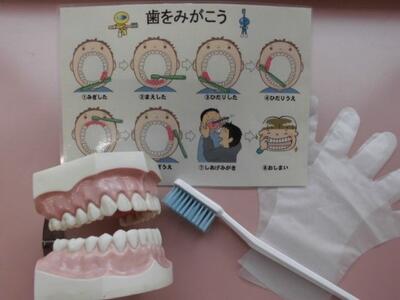 11月は、養護教諭が各クラスをまわり、歯みがき指導を行っています。個別に仕上げ磨きをしたり、磨いた歯をみせてもらい、磨き残しがないかチェックしたりしています。大きな歯の模型を見せるとみんな興味津々!歯の模型を一生懸命磨いてくれます。みんな歯みがきが上手になってきています。