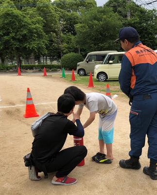避難後には各学部代表児童生徒による水消火器体験も行い、最後までみんな集中して訓練を行うことができました。