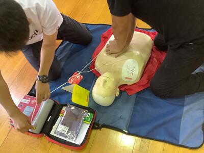 日本赤十字社熊本県支部から坂本先生を講師にお招きし、「胸骨圧迫」や「AED」の使用方法について実践形式の研修でした。