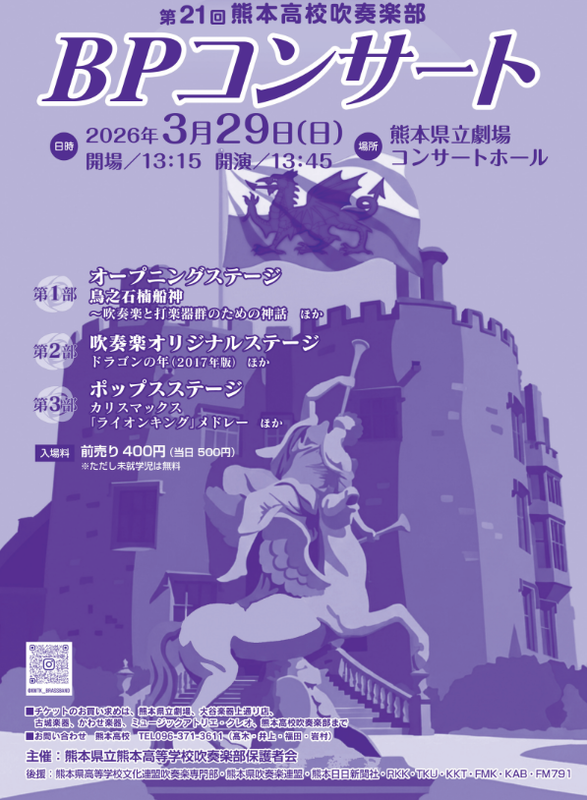 3月29日(日)の13:45~熊本県立劇場コンサートホールにて本校吹奏楽部の定期演奏会であるBPコンサートを開催します。