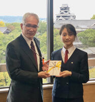 令和3年11月12日、本校創立120周年記念文化祭において販売した「~支~ 熊本城・奇跡の一本石垣」が描かれたポストカードの収益金63,000円を熊本市に寄附しました。このポストカードは本校美術部3年一野羽亜奈さんの作品が第45回全国高等学校総合文化祭に熊本県代表として出品されたことから作成したもので、本校創立120周年記念文化祭において販売し、今回、その収益金全額を熊本城復旧のため熊本市に寄附しました。なお、一野さんの作品「~支~熊本城・奇跡の一本石垣」は、令和4年9月まで熊本県議会棟1階ロビーに展示されています。