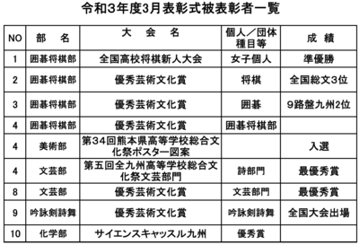 3月24日(木)に,表彰式・終業式が行われました。久しぶりに、在校生全員が体育館に集まる機会となりました。表彰式では、上記の団体が優秀な結果を残すことができました。終業式では、各課から以下の内容の話がありました。