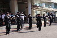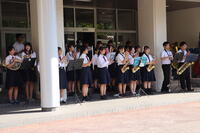 9月16日(金)に本校玄関前にて藤崎八幡宮例大祭青年江原会飾卸出陣式が開催され、応援団部と吹奏楽部の生徒が参加しました。久しぶりの開催となりますが、活気あふれる出陣式の迫力に参加した生徒たちは圧倒されているようでした。