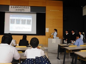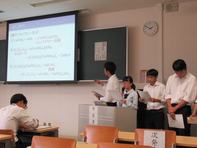 化学部2年生11名(全員 理数科2年生)で、「種々の材料を用いた銅アンモニアレーヨンの合成」に関する研究発表を行いました。