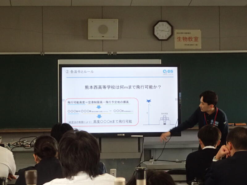 11月18日(月)の1・2限目、サイエンス情報科2年生を対象にドローン授業(座学)を行いました。(一社)九州ドローンスクールの方を講師として迎え、ドローンに関する法令・ルール、飛行原理等について学習をしました。学習した内容を踏まえ、11月25日(月)5・6限目にドローン授業(実技)を本校体育館で行う予定です。