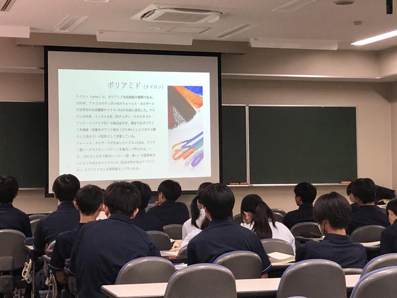 8月29日(金)、サイエンス情報科1年生を対象に熊本大学大学院先端科学研究部材料・応用化学専攻教授の高藤様の講義及び実験が熊本大学で行われました。「界面重合によるポリアミドの合成と染色」は、高校3年生で習う内容であるが、化学全般に対する学習意欲を高める上で最適な内容でした。生徒たちは、高藤様の話を熱心に聞き、やるべきことを率先して行動していました。また、技術部の鬼束様から化学実験の心構えやルールを丁寧に説明していただいたことで安全に実験を行うことができました。