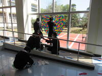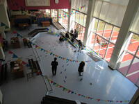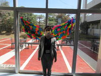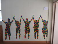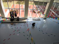生徒ホールのフロアには色紙で幾つもの足跡が表現されています。このグループのテーマは「人生」。人の生涯を足型で表現し、様々な足跡が交差しているのは人と人とが関わり合いながら生きていくことを表しているとのことです。また、大きなガラス窓にカラフルな翼が色紙で象(かたど)られています。その翼の前に立つことで、翼を持ったような気持ちに成って欲しいという仕掛けです。このグループのテーマは「自由」。廊下の天井からたくさんの紙飛行機が吊り下げられていたり、廊下の曲がり角に手をとりあって飛び跳ねている人物像が紙で貼り付けてあったりと愉快な出会いの連続です。