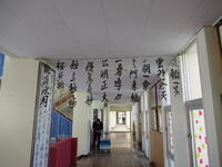 「生徒ホールがすごいことになっていますよ!」と事務室の職員の方から話を聞き、行ってみると空間アートの世界に一変していました。1年生の美術選択者の皆さんがそれぞれ各チームに分かれ、作品を仕上げている途中でした。また、書道選択者による切り取られた紙文字の飾りもあり、目を引きました。これらが「インスタレーション」というものかと感嘆しました。