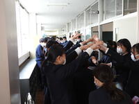 生徒会長の濱﨑さんの御礼の言葉、そして校歌演奏を全員で聴き、式は終了。その後、18人の転・退任者はスタジオを出て、卒業生が待つ体育館、1,2年生がいる教室棟を歩いて回られ、生徒の皆さんとの交流が行われたのです。