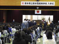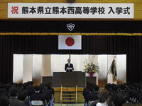 午後2時から、「令和4年度第48回入学式」を挙行しました。春爛漫、入学を祝福するかのような青空が広がりました。普通科248人、うち体育コース36人、サイエンス情報科31人、合わせて279人の新入生を迎えました。この3年間で最も多い入学生であり、学校に活気が満ちあふれました。式後、玄関の「熊本県立熊本西高等学校」と墨書された木製看板の前で記念撮影する新入生と保護者の姿が目立ちました。緊張感の中にも笑顔が見られます。