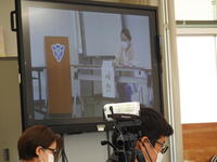 育西会役員が会議室で議事を行い、その様子を各教室に配信し、それぞれの教室から保護者の皆さんの質問も受けられる双方向の形式をとりました。昨年度、西高は熊本県のICT特定推進校に選ばれ、授業の改善、学校行事の効率化など率先してICT(情報通信技術)を活用してきました。今回の総会の方式もその取り組みの一つです。
