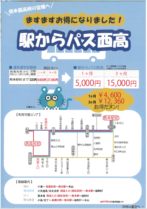 熊本駅から熊本西高校までの路線バスが最大4,600円お得にご利用できます。
