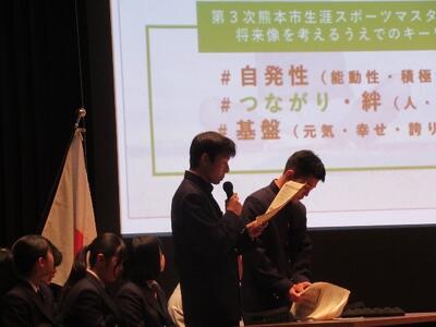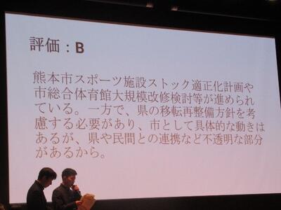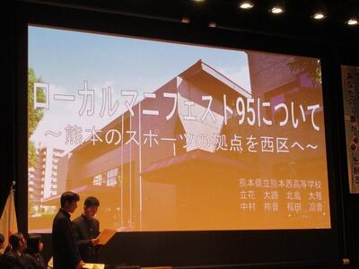マニフェスト95「プロスポーツや地域スポーツを支援し、老朽化したスポーツ施設等の再編、更新について熊本県や民間資本と連携して検討します。また、施設の災害時利用など多目的に活用出来るよう改善していきます。【任期中実現】」について検証をし、高校生ならではのアイディアを提言しました。