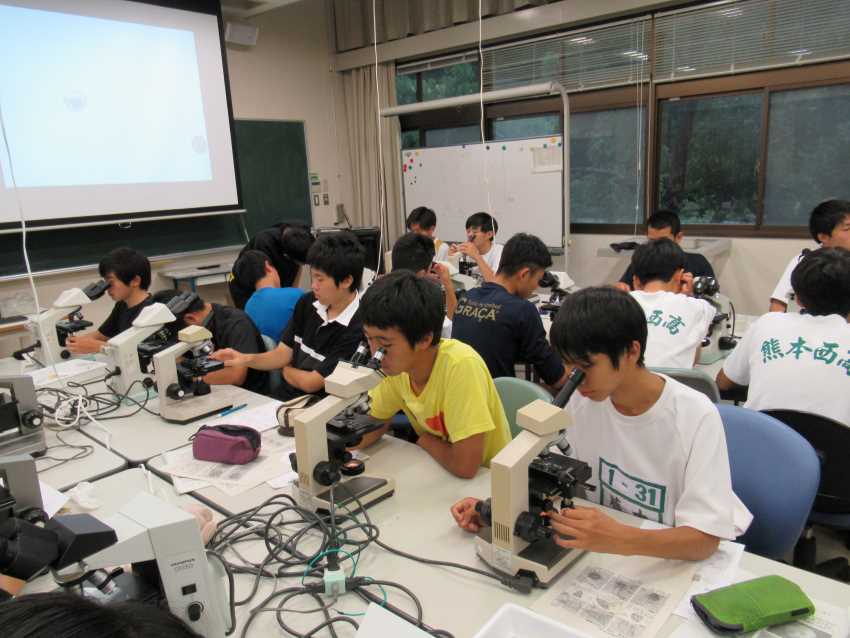 大雨、洪水の警報が出されるあいにくの気象状況のため、「プランクトンの採集・観察」は中止となり、安全のために途中で、実習を打ち切って帰校することとなってしまいま した。それでも、ぎりぎりまで、「ウニの発生」ほ観察は続けました。