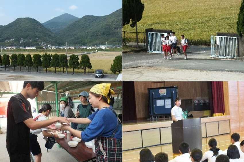 左下:育西会恒例豚汁の提供 右下:閉会式 校長による講評の様子