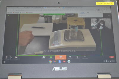 熊本大学 大学院先端科学研究部 材料・応用化学専攻の高藤教授から、工学部応用化学の学問分野について、化学実験の基礎、ナイロン66の重合実験について、講義や解説をしていただきました。また、2名の大学院生からも実験操作や概要等についての説明や研究室ツアーを配信いただきました。