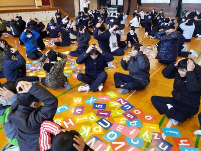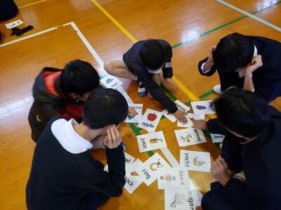 まずウォーミングアップとして体を使ってアルファベットを表わした後、早速班に分かれかるた交流を行いました。