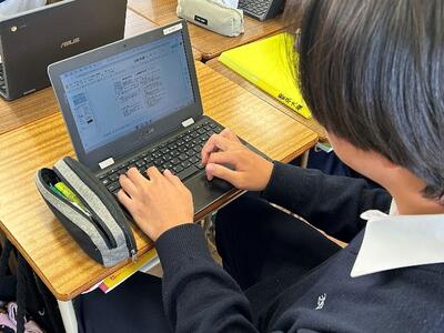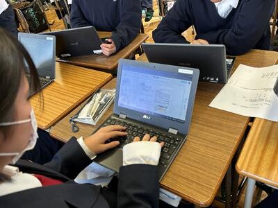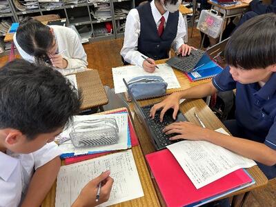 2年生の地域探究に向けての練習となる「ミニ探究」が始まって2回目となります。クラス内でテーマ毎に班を作って、探究活動に挑みます。疑問に思うことをそれぞれが書き出し、インターネットで調べて、答えのないものを洗い出している作業をしています。テーマ設定への第1段階です。クラスを回ってみましたが、どのクラスも活発に活動していました。今後に大いに期待が持てます。楽しみです。