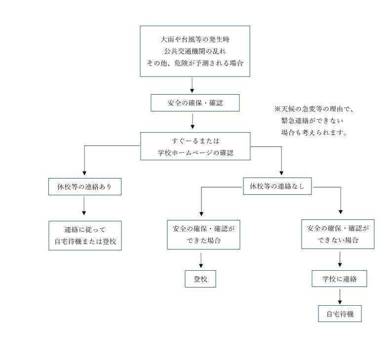 - 大雨洪水警報等発令、強風、大雪、雷及び冠水の際や、土砂災害及び公共交通機関の乱れ等が予測される場合等には、身の安全を第一に考えて自宅待機し、安全な状態になってから登校するようにしてください。