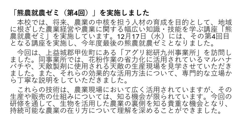 農業の中核を担う立場として、地域に根ざした農業経営や農業に関する活動を展開できるよう、各分野の専門家を招いた講座である「熊農就農ゼミ」を11月28日(金)に行いました。通常であれば専門家をお招きして本校で講演という形式なのですが、今回は校外に出てゼミを実施しました。