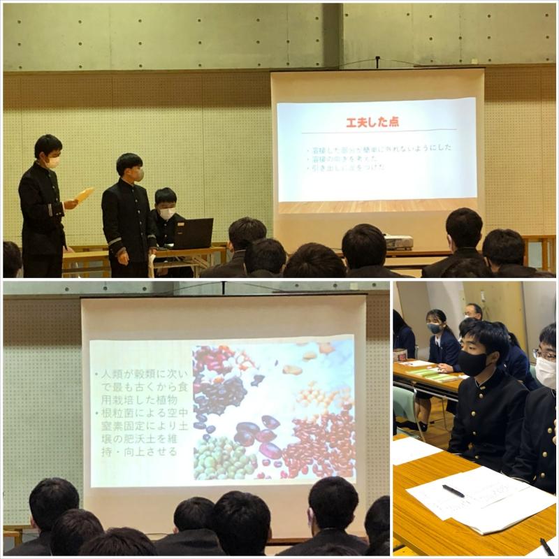 栽培する作物ごとに7つの班に分かれた生徒達が、それぞれにテーマを設定し、約半年かけて調査・研究を続けてきました。各班趣向を凝らした発表が行われ、とても有意義な発表会となりました。
