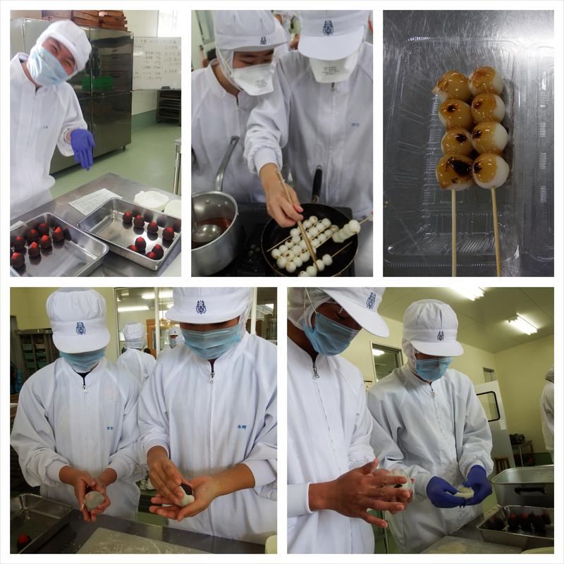 1年生は米粉類を学習中です。この季節といえば、いちご大福ですね! 熱々の求肥に悪戦苦闘しました… みたらし団子も上手に出来ました