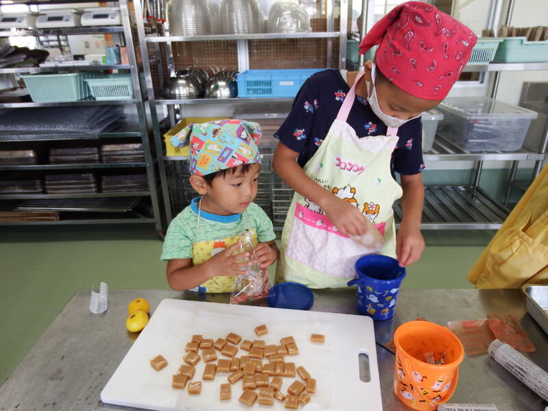 〇ボールに材料を入れて混ぜれば完成で簡単かなと思っていました。でも実際は、デコレーションケーキのときくらい混ぜる力が必要で驚きました。汗かくくらい混ぜて、できたときの達成感がすごかったです。水あめを入れる製造は初めてだなと思いました。