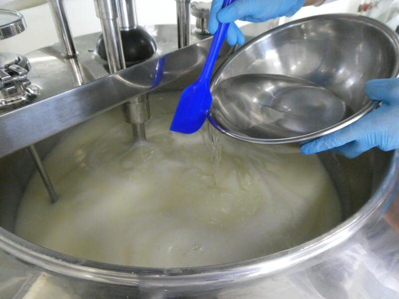 水に溶かした凝乳酵素を加えます。この酵素はチーズの製造に不可欠で、1gで30~50Lの牛乳を凝固させる力があります。