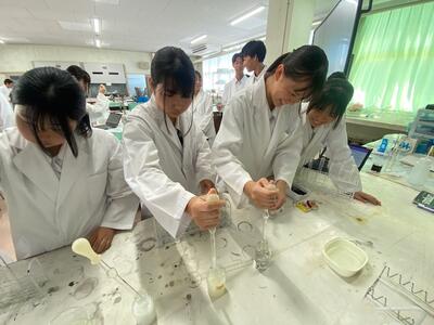 今回は酵母の固定化に関する実験!各班で協力し酵母を混ぜたアルギン酸ナトリウムを上手に滴下して、塩化カルシウムと反応させて酵母を固定化しました。
