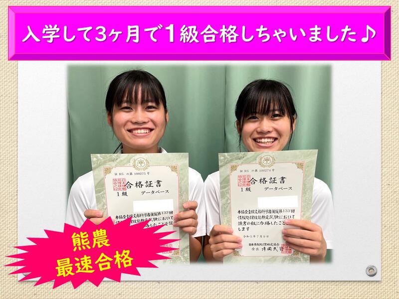 入学して3ヶ月で1級合格しちゃいました♪(農業経済科1年)
