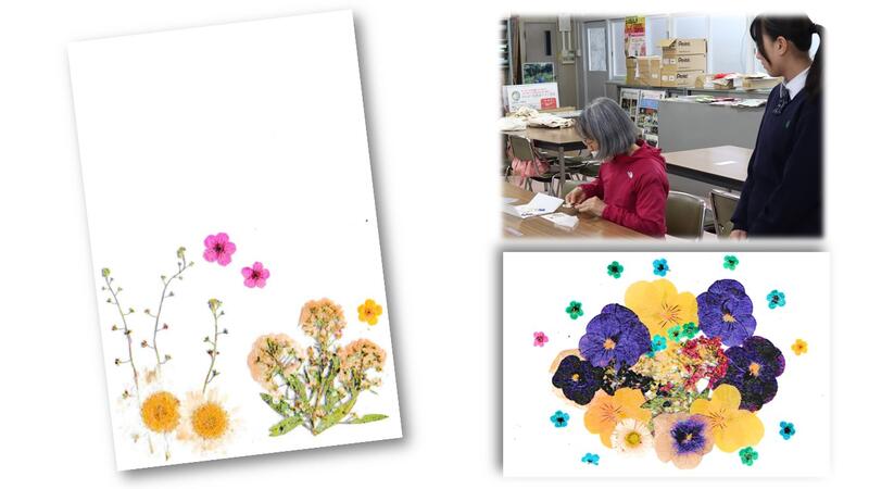 「きれいに色が残って、素敵な押し花ですね」と言って頂き、準備をしてきた生徒たちも嬉しかったです。ハガキに押し花をデザインし、皆さん気に入ったハガキが完成していました