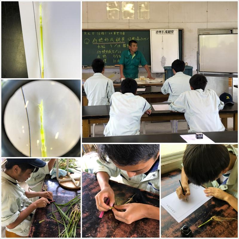 農業科2年生の作物実習では、水稲の幼穂形成観察をしました!幼穂とは、読んで字のごとく、幼い穂のことで、これが次第に大きくなり、秋にはたくさんのお米をつけた稲穂になります!つい先日田植えをしたばかりのような気がしましたが、稲は順調に成長しているようです!