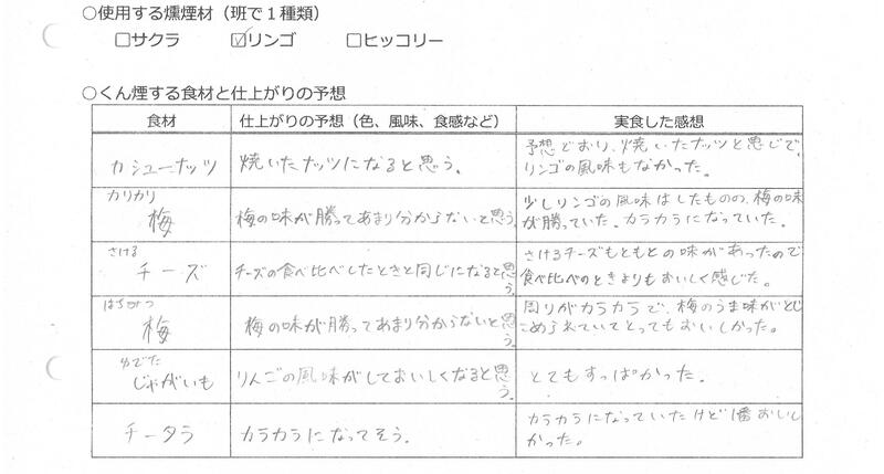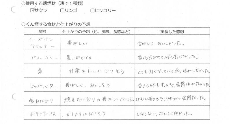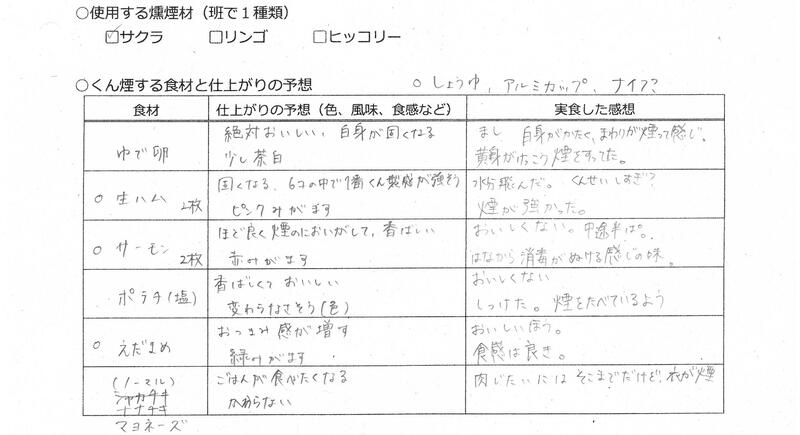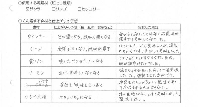 今回の授業では、生徒が自分たちで考えて選び抜いた食材をくん煙し、できあがったくん製を実食することで、どのような変化が生じたのかを確かめました予想外の変化や外観と味のギャップなど、実際に食べることで得られた気付きや発見が印象に残った生徒も多くいたようです