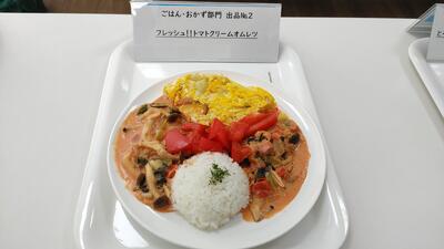 Oさんは「フレッシュ!!トマトクリームオムレツ」を考案して「ごはん・おかず部門」に出品トマトの酸味と生クリームのまろやかさを生かした素朴な味のクリームと、彩り豊かな野菜をたくさんとれることが特徴の一品です