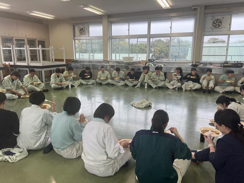畜産科では屋内で1~3年が集まり、3年生による進行のもと畜産物を生産してくれる家畜への感謝や日頃の給餌(きゅうじ)や畜舎の清掃、搾乳実習の重要さをあらためて確認し、クラスの代表が調理してくれたカレーを会食しました。