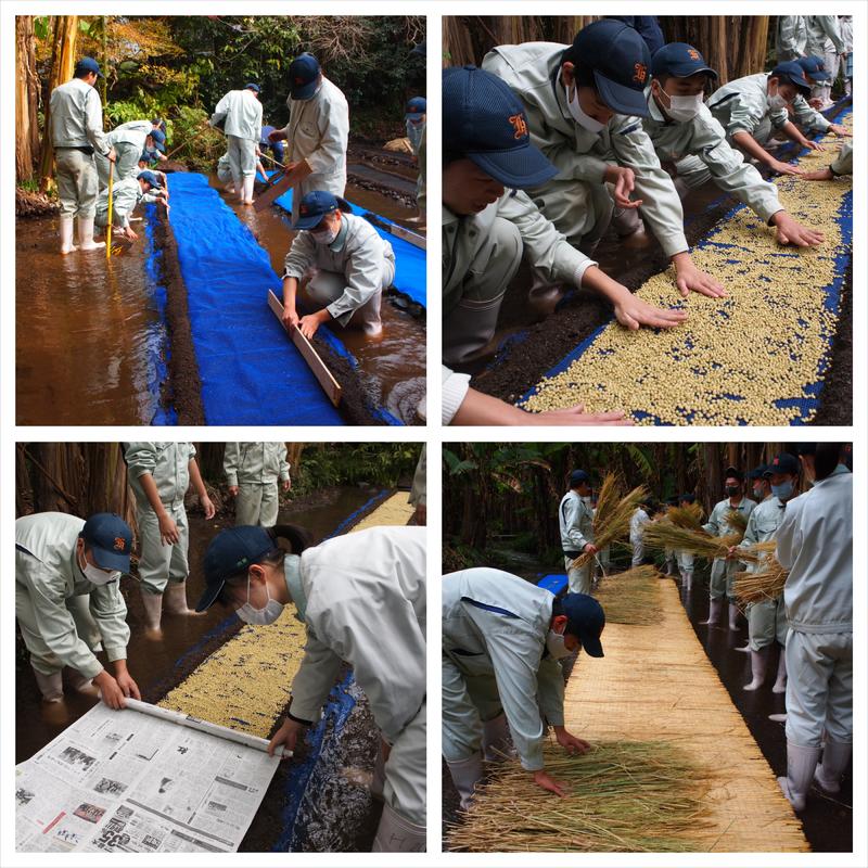 今日は、湧水の中の除草、落ち葉かき、うねたてをしました。今週、3年野菜専攻生が種まきをします。