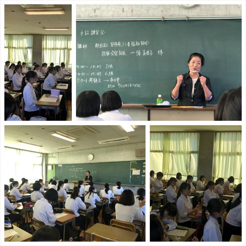 熊本県教育委員会が主催するインターンシップ等推進事業を利用した外部講師授業です。家庭総合で、共生社会について学んでおり、障害を持つ人々の暮らしについて、毎年ご講演頂いている、熊本市ろう者福祉協会の一條真理子様をお招きして、2時間、講話と手話講習をして頂きました。