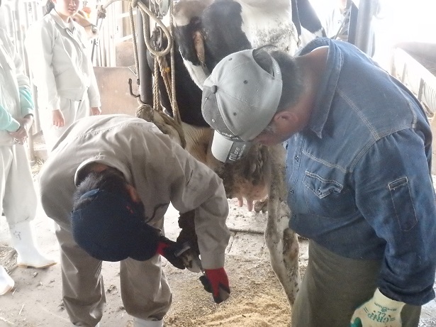 現在、畜産科3年牛専攻生4名のグループで「酪農経営における乳房炎予防について」というテーマでプロジェクト学習に取り組んでいますが、その一環として11月14日(木)午後の搾乳でラクトコーダーによる搾乳技術の検証を行いました。トップの写真にある機械をミルカーに装着し、搾乳刺激をして何分でミルカーを取り付けたかとか、泌乳開始から何分でしぼり終わったか、乳頭孔スコアなどを測定されました。指導には、らくのうマザーズ営農指導課の3名の方にお世話になりました。多くの方の指導をあおぎながら、これからもより安全・安心な牛乳生産を目指して頑張っていきます。
