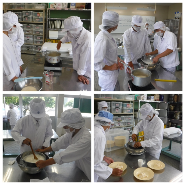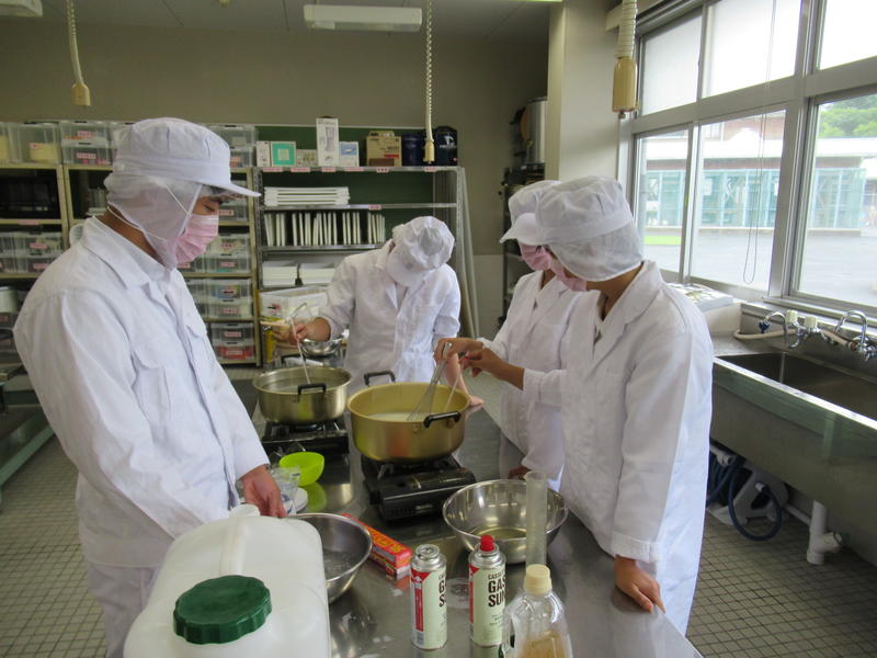 学校の牛乳を使用して、アイスクリーム製造実習を行いました。班で協力しながら、美味しいアイスクリームを作りました。今後も、学校の生産物を使用した製造実習に取り組んでいきます。