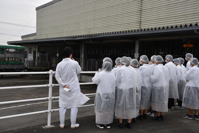 午前中食肉衛生検査所では、食肉の安全性についての説明を受けた後、畜産流通センター内の牛肉・豚肉のカット処理の工程や実際にこれから処理される豚が搬入される現場を見学させていただきました。本校で飼養されている乳牛や肉牛の一部もこの流通センターに出荷されており、動物たちの冥福を祈ると同時に私たちが普段食べている牛肉や豚肉への感謝の思いを再認識しました。