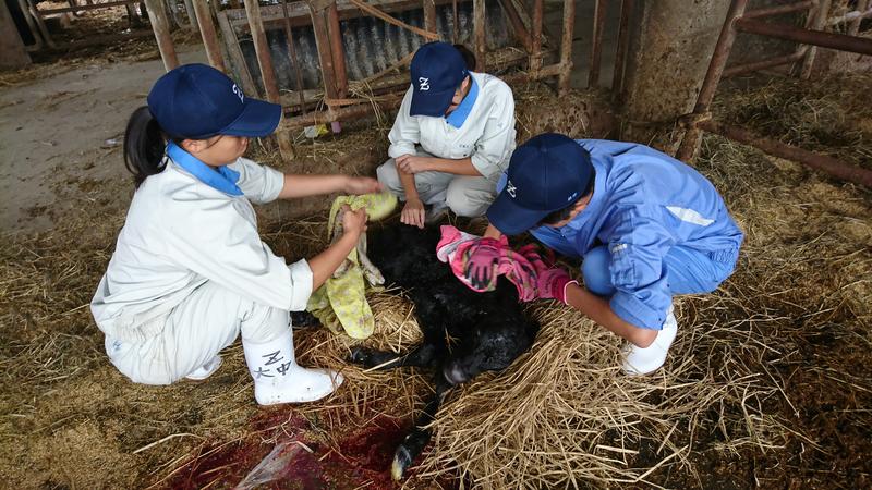 10月23日(水)と24日(木)の連続で子牛が生まれました。23日は実習の授業中で3人の生徒と一緒にミント(母牛)号の分娩を介助して無事男の子が生まれました。24日は、夕方からユメ(母牛)号の様子がおかしかったので注意していたら7時くらいから分娩が始まりました。今回もお産がきつかったのでみんなで手伝って無事女の子が生まれました。1頭目は、交雑種で黒毛の男の子、2頭目はホルスタイン種で色白の女の子でした。みんなでしっかりかわいがっています。