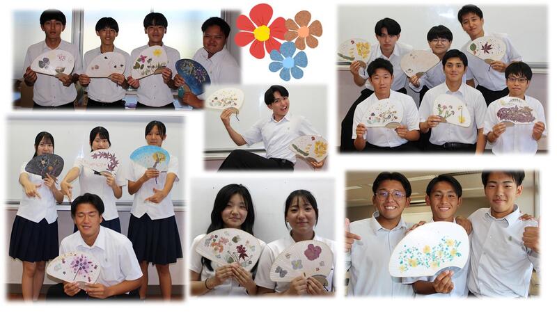 押し花を教えていらっしゃる村崎先生に来て頂き、押し花の押し方、デザイン、押し花絵の作り方などをご指導頂きグループ作品、個人作品の作成にあたりました笑うグループ作品はみんなで試行錯誤しながら楽しく作成し、文部科学大臣賞まで受賞することができ、生徒も大喜びですキラキラ