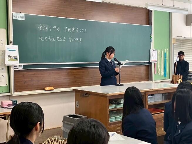 校内意見発表会に生活科代表として、3年三浦さん、2年龍野さんが全校生徒の前で意見発表を行いました。