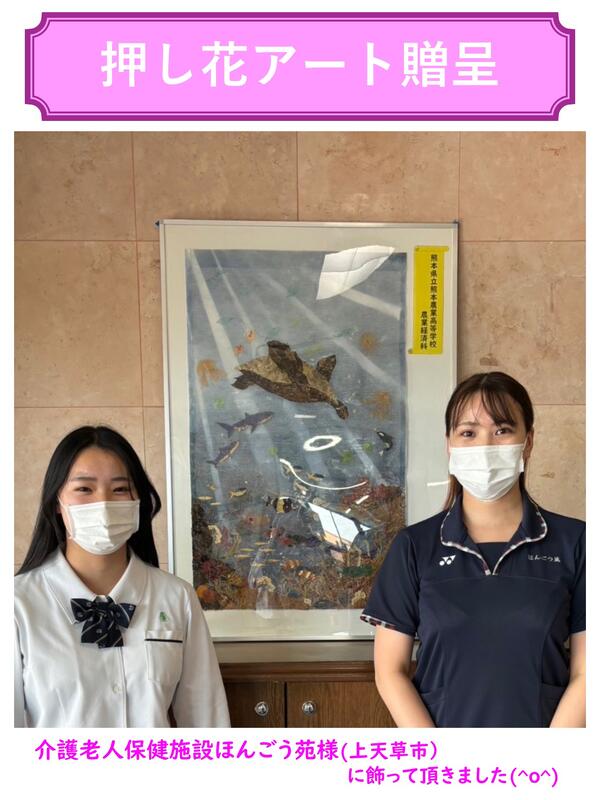第20回全国高校生押し花コンテストで「福岡県教育委員会賞」を受賞したタイトル「海の物語」のタペストリーを介護老人保健施設ほんごう苑様に寄贈させて頂きました。