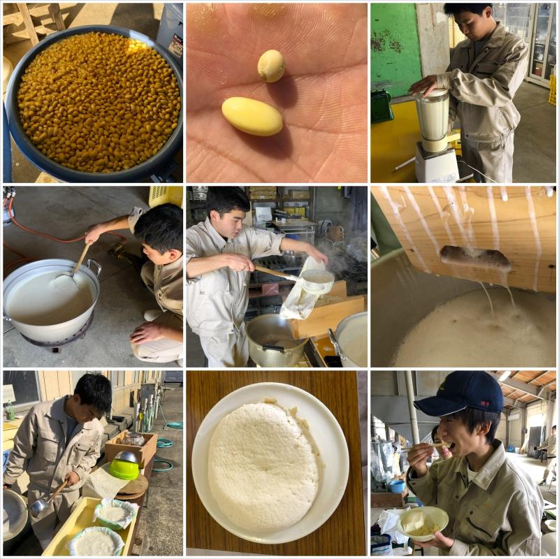 先週金曜日、課題研究の授業で豆腐作りをしました。原材料の大豆は農業科の圃場で栽培したもの使用したので、「熊農産大豆100%豆腐」といったところでしょうか(^○^) 初めての豆腐作りということもあり、悪戦苦闘をしながらもどうにか豆腐(らしきもの)が完成しました。完成後には作物専攻生が試食し、「見た目はイマイチだけどなかなか美味しい!」「今後はもっと豆腐を大切に食べよう。」などの感想があがっていました!これは自分たちで実際に作ってみたからこその感想だったと思います!やっぱり体験に勝るものはなし!ですね。生徒たちにとって今回の実習はとても良い経験になったようです!